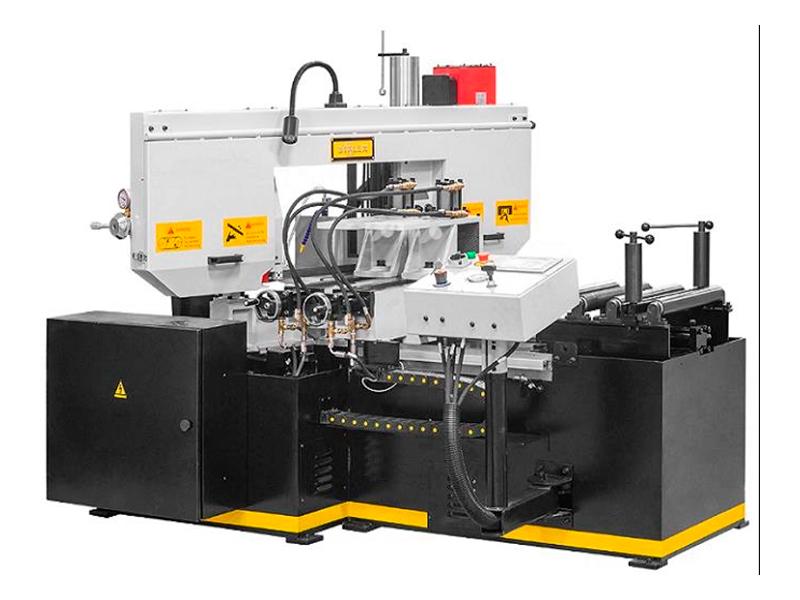 Модель Stalex BS-350GA является автоматическим ленточнопильным станком, колонного типа. Автоматический ленточнопильный станок, предназначен для пиления труб и сплошных заготовок, максимальным диаметром круга 350 мм и прямоугольной заготовки 500x350 мм под углом 90°, а также с возможностью поворота рамы для пиления заготовок под углом 45°. Ленточнопильный станок имеет 2 вертикальные стойки (колонны): 1 колонна основная большего диаметра по которой вертикально перемещается горизонтальная пильная рама. 2 колонна направляющая, данная колонна задаёт окончательное жёсткое направление рамы при работе и на холостом ходу. Пильная рама, представляет собой стальную сварную конструкцию На автоматических станках возможна работа как в ручном режиме, когда каждая операция выполняется вручную посредством нажатия соответствующей кнопки, так и в автоматическом режиме, когда станок выполняет весь цикл резания (зажим заготовки – подвод заготовки – запуск пилы – опускание рамы – остановка пилы – подъем рамы – отжим тисков). В последнем случае оператор должен лишь обеспечить подачу заготовок и нажатие кнопки «Пуск». Станок оснащен гидравлическими тисками с возможностью быстрого зажима заготовок. Помимо гидравлического зажатия, тисков имеют механический ход тисков. На основной панели расположены: цветной сенсорный дисплей, с помощью которого можно задать программу и отслеживать процесс пиления, регулятор скорости опускания пилы и кнопка аварийного останова.