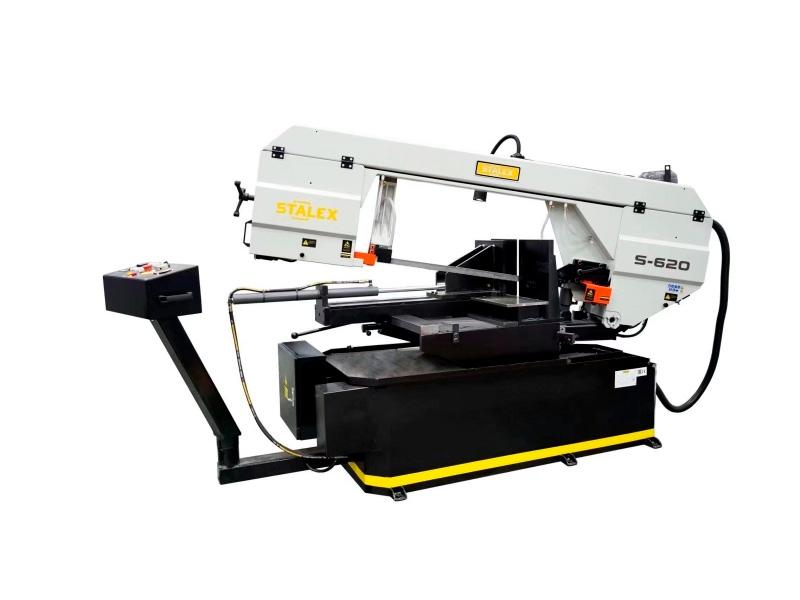 Модель Stalex S-620 является гидравлическим ленточнопильным станком, консольного типа. На полуавтоматических станках возможна работа как в ручном режиме, когда каждая операция выполняется вручную посредством нажатия соответствующей кнопки, так и в автоматическом режиме, когда станок выполняет весь цикл резания (зажим заготовки – запуск пилы – опускание рамы – остановка пилы – подъем рамы – отжим тисков). В последнем случае оператор должен лишь обеспечить подачу заготовок и нажатие кнопки «Пуск» Гидравлические тиски раздвигаются на 620 мм, что позволяет пилить прямоугольною заготовку с размерами, превышающими рабочий просвет подъема пильной рамы.
